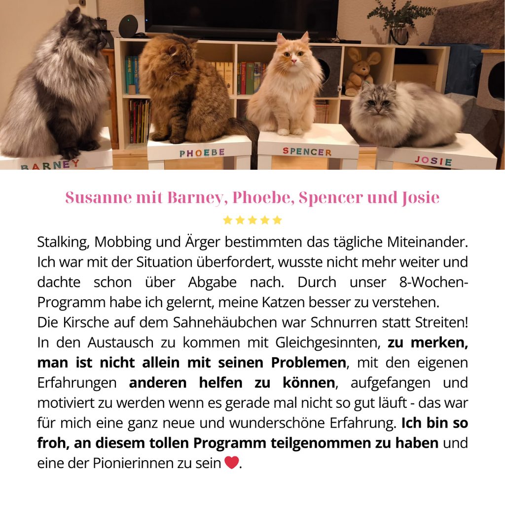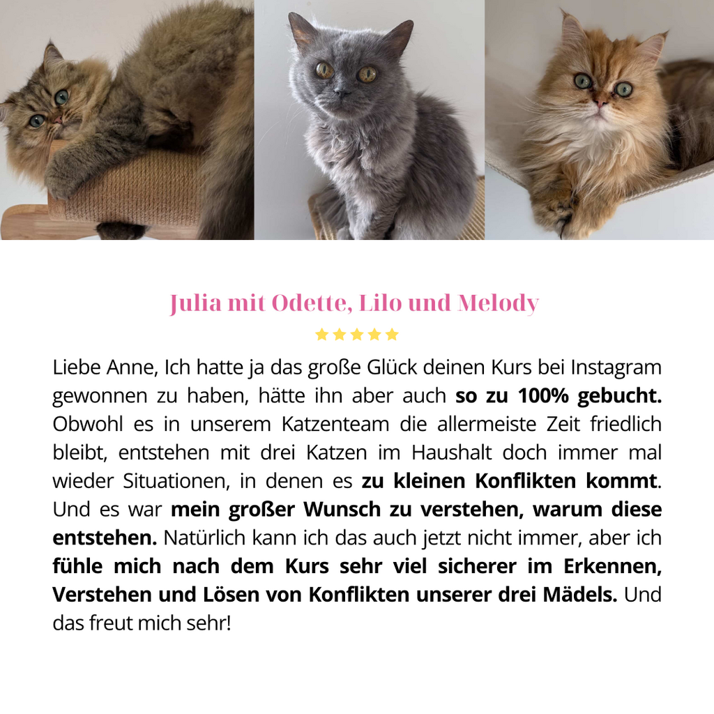 Das Programm ist darauf ausgelegt, dich und dein gesamtes Katzenteam zu unterstützen. Auch bei sehr unterschiedlichen Herausforderungen lernst du, Spannungen zu erkennen, Konflikte zu entschärfen und ein harmonisches Zusammenleben zu fördern. Für individuelle Fragen zu deinem Team kannst du dich gern direkt an info@katztastisch.de wenden, ich helfe dir bei der Entscheidungsfindung.